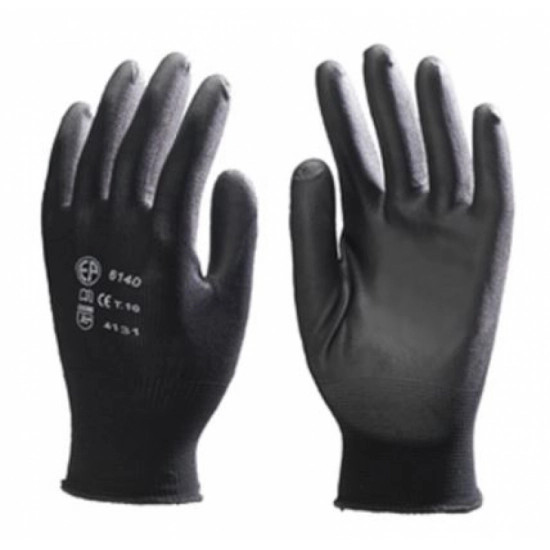 FEKETE PRECÍZIÓS KESZTYŰ, PU MÁRTOTT TENYÉRREL: • kötött, rugalmas, nagy szakítószilárdságú 100% poliészter szál • tenyéren poli