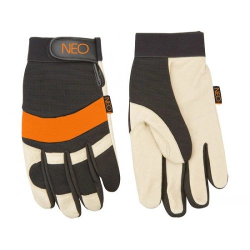 NEO 10” méretű védőkesztyű. A munkavégzés során védelmet biztosít a kéznek szennyeződések, karcolások, zúzódások és káros hatások ellen. Kiváló minőségű sertés színbőrből készül. Igen magas a kopásállósága. Tépőzárral állítható mandzsetta - hozzáigazítható a csuklóhoz. A CE jelölés a biztonság garanciája, bizonyítja, hogy a termék teljesít minden európai uniós követelményt. A NEO márka a professzionális igényeket is kielégíti.