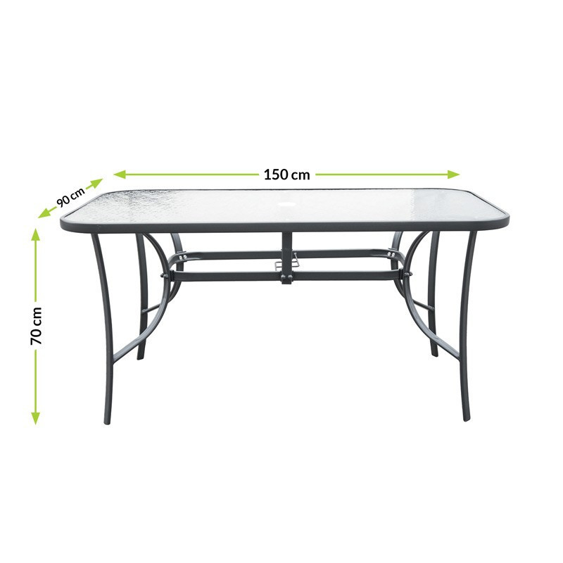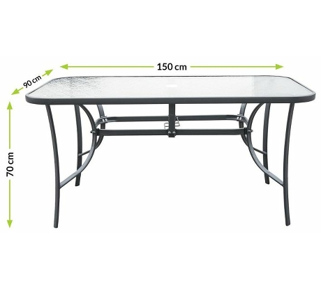 A kerti asztal szerkezete acélból készül. A teteje 5 mm-es edzett üvegből készül , amely ellenáll a kisebb karcolásoknak. A felhasznált anyagok biztosítják az időjárási viszonyokkal szembeni ellenállást.