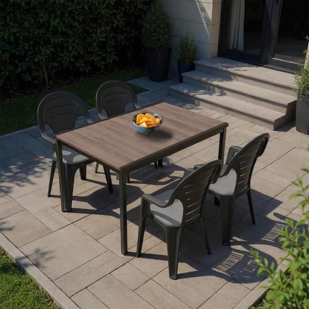 A Lagos 4 + 1 kerti szett asztallapja – a Porto 160 modell – DecoCoat™ eljárással készült, fa?hatású polimerből. Ez a speciális, UV-stabilizált műanyag nem szívja magába a vizet, nem vetemedik, és a nyári forróság vagy a téli fagy sem tesz benne kárt. Az asztallapot egy porszórt, korrózió?álló fémváz merevíti, így egyszerre kapod meg a természetes megjelenést és az acélos tartósságot.
