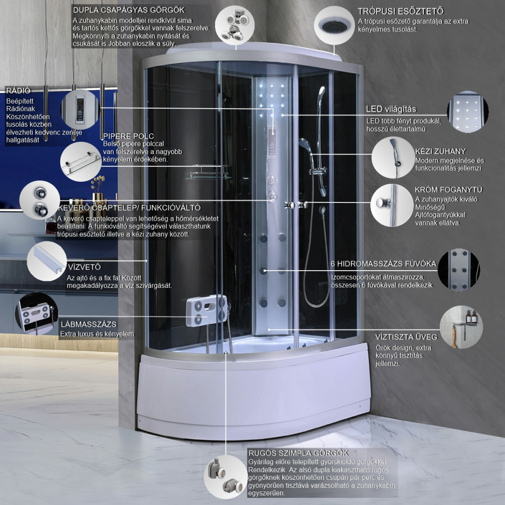A Lia zuhanykabin számos hasznos funkcióval rendelkezik. Pipere polccal van felszerelve, melynek köszönhetően rendbe tudja tartani a tisztálkodáshoz szükséges eszközeit. Trópusi esőztetővel és kézi zuhannyal is rendelkezik, melyet a funkcióváltóval tud váltakoztatni. A víz hőmérsékletét a keverő csapteleppel tudja beállítani. A trópusi esőztető mellett helyezkedik el kettő szellőző, melyeknek köszönhetően távozik a felesleges meleg gőz ezzel megakadályozva a kabin párásodását. A kabinba 6 db hidromasszázs fúvóka van beszerelve, lábmasszírozó és rádió melyek biztosítják az extra kényelmet. Ezeken kívűl LED és felső világítás is van a kabinban.