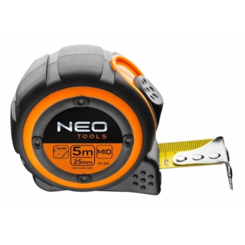 NEO acél mérőszalag, dupla szalagreteszeléssel. A mérőszalag poliamid bevonata védi a rányomtatott skálát a kopástól. A mágneses vég és a szalag profilja megkönnyíti a mérés kivitelezését. A tekercselési ütközéscsillapító védi a végzáró kampót a letöréstől. A szalagvég három szegeccsel megerősített. A ház ergonómikus formakialakítása biztos és kényelmes fogást nyújt, a csúszásmentes kivitel biztosítja a használati komfortot és biztonságot. Megbízhatóságának garanciája a MID európai uniós mérőeszköz irányelv követelményeinek megfelelő kivitel. A NEO márka a professzionális igényeket is kielégíti.
