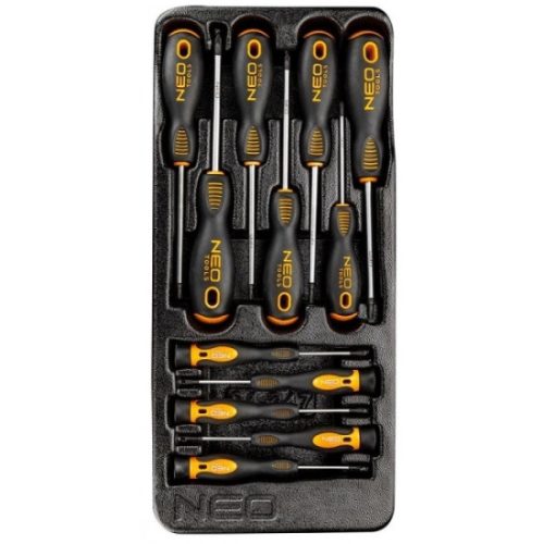 NEO csavarhúzó 12 csavarhúzó, a csúcsok kivételesen erős S2 acél ötvözetből készülnek. A csúcsok munkafeje hőmegmunkálva, melynek köszönhetően megfelelő a keménysége és hajlítószilárdsága. A csavarhúzók mágneses, szilárdított fejjel rendelkeznek. A profilozott hüvelykujj támasztós, háromszöges kialakítású markolat csökkenti a kéze megterhelését a munka közben és megkönnyíti az optimális nyomaték elérését. A kétanyagú markolat megakadályozza a kicsúszást és ellenáll a vegyszerek, olajok és zsírok hatásának. A szerszámok praktikus, a NEO 84-221 és 84-222 szerszámos szekrények fiókjaiba illő műanyag bőröndben leszállítva. A szerszám minőségét a TÜV tanúsítvány és a gyártó 25 éves garancia igazolja. A NEO márka a professzionális igényeket is kielégíti.