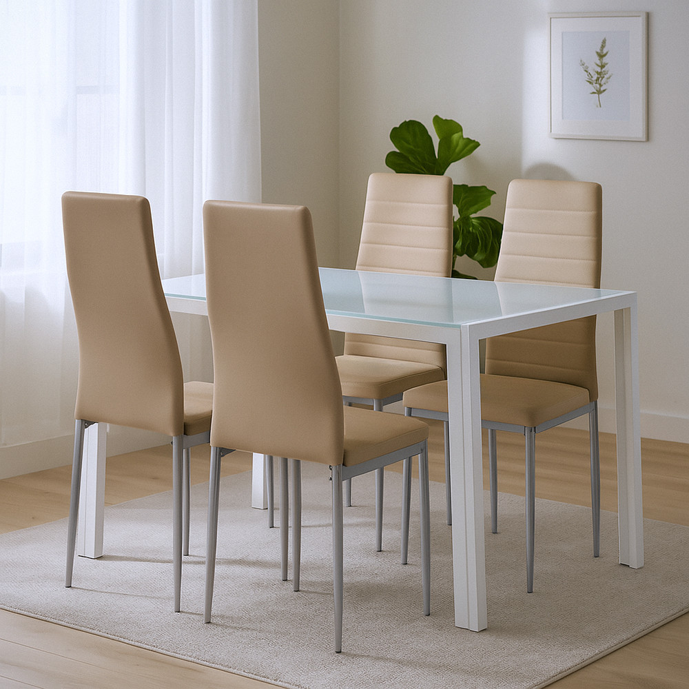 Mabel 4+1 étkezőgarnitúra – Modern stílus bézs székekkel és edzett üvegasztallal