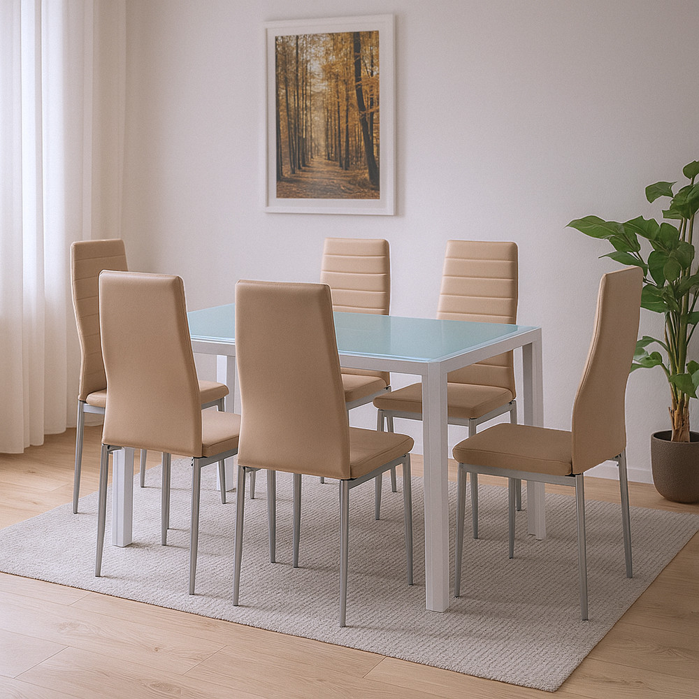 Mabel 6+1 étkezőgarnitúra – Modern stílus bézs székekkel és edzett üvegasztallal