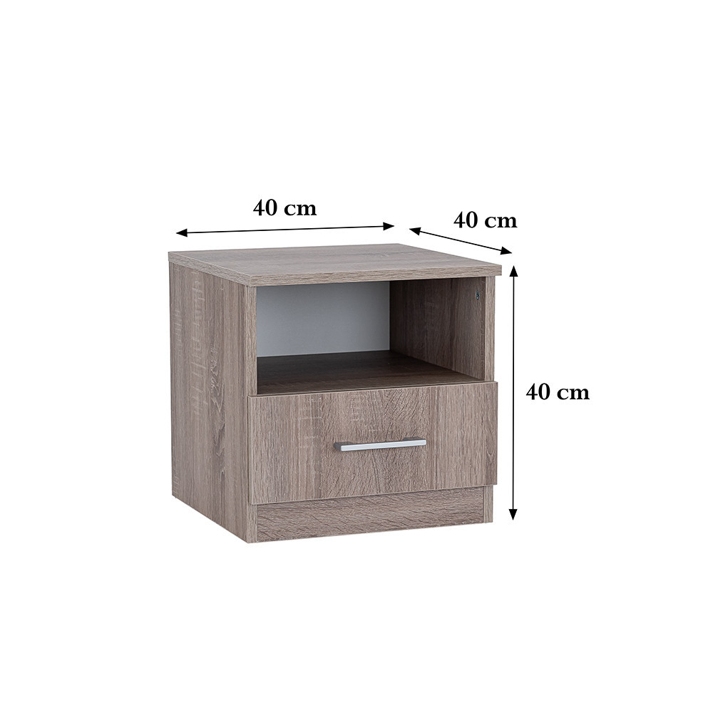 Az éjjeliszekrény 40x40x40 cm-es mérete tökéletesen illeszkedik a kisebb hálószobákba is, anélkül, hogy túl sok helyet foglalna. A görgős fiók simán nyílik és záródik, ennek köszönhetően könnyen hozzáférhetsz a könyvekhez, szemüveghez vagy telefonhoz. Az éjjeliszekrény további egy polccal lett kialakítva, ahol a fontosabb, gyakran használt tárgyakat tarthatod.