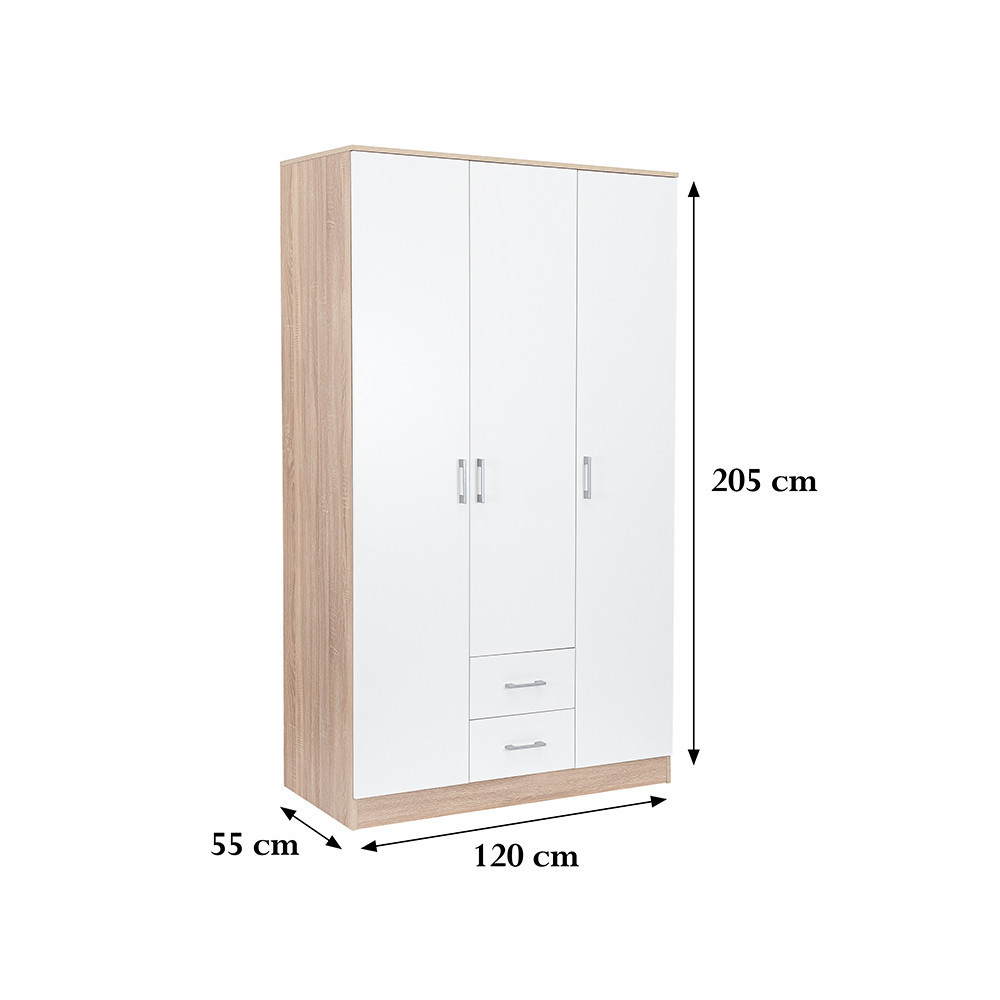 Az elegáns fehér front és a fahatású sonoma tölgy korpusz ötvözete tökéletes harmóniát teremt a nappaliba vagy a hálószobába egyaránt. A 205 cm magas, 120 cm széles és 55 cm mély gardróbszekrény ideális választás mindenki számára, aki szeretné rendszerezni ruháit és kiegészítőit.