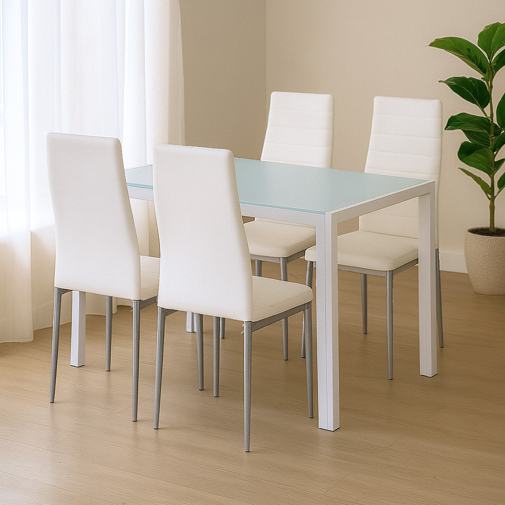 A textilbőr székek elegáns megjelenése és a puha párnázottság kellemes ülésélményt nyújt, míg az üveglapos asztal légies, modern hatást kelt a térben. A tartósságot a masszív fémváz és a karcálló üveglap garantálja.