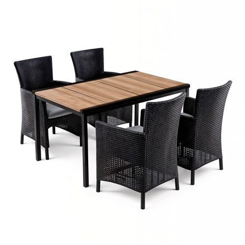 Egyetlen garnitúrában minden, ami a családi reggelitől a baráti grillpartiig kell: négy kényelmes fotel + egy tágas étkezőasztal, nulla karbantartás mellett.