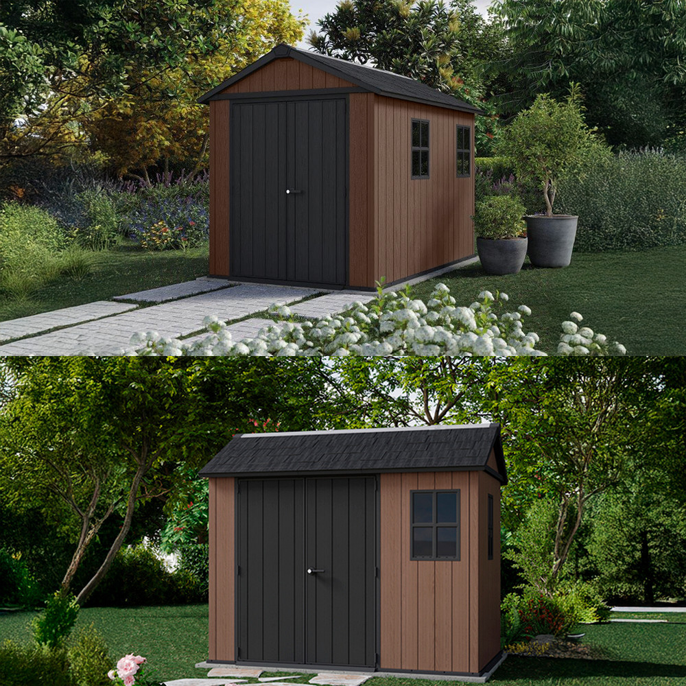 A Newton Plus kerti ház nemcsak praktikus, hanem esztétikus is. A barna színű EvoTech anyag valósághű fa textúrát biztosít, anélkül hogy a fa gondozási igényeivel kellene számolni.