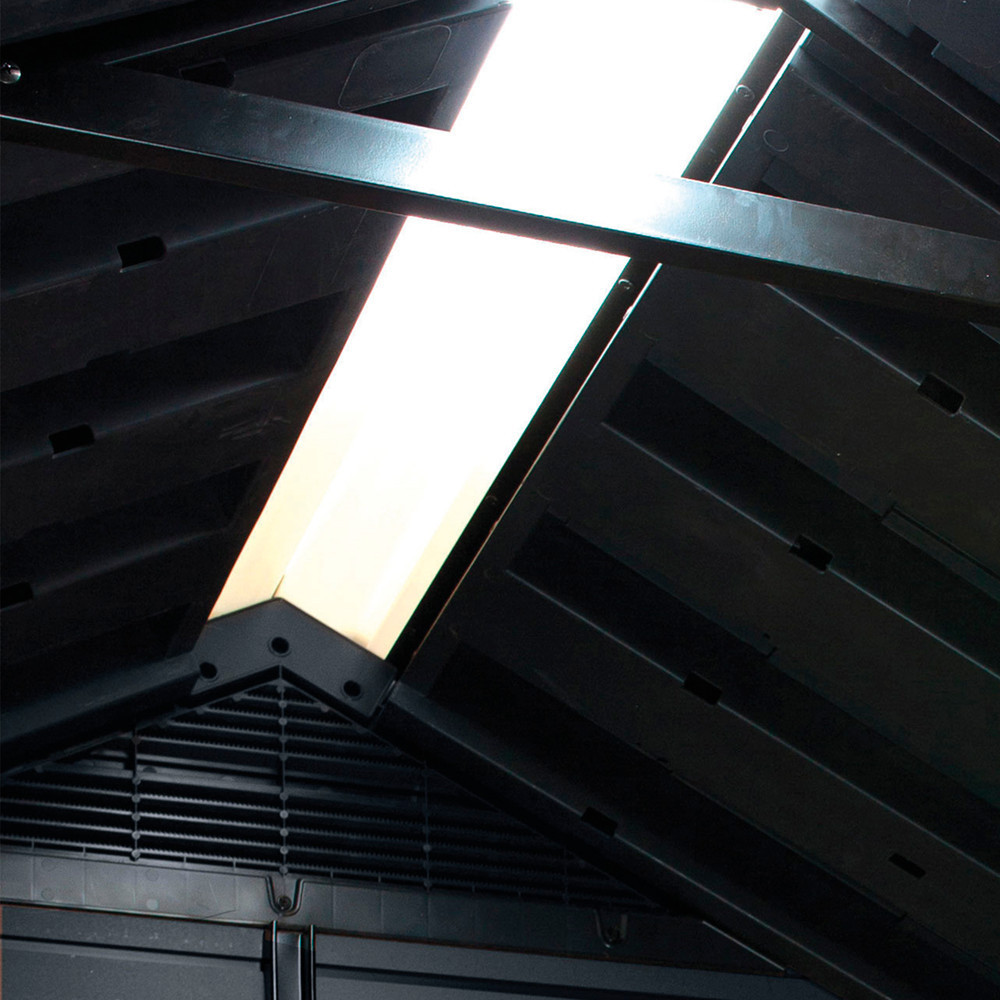 A Newton Plus kerti ház extra erős tetőszerkezettel rendelkezik, amely akár 150 kg/m² terhelést is elbír – így még a hó sem jelent problémát. A beépített padlópanel védi az eszközöket a sártól, csapadéktól és rágcsálóktól, így minden tárolt tárgy hosszú távon is megőrzi állapotát.