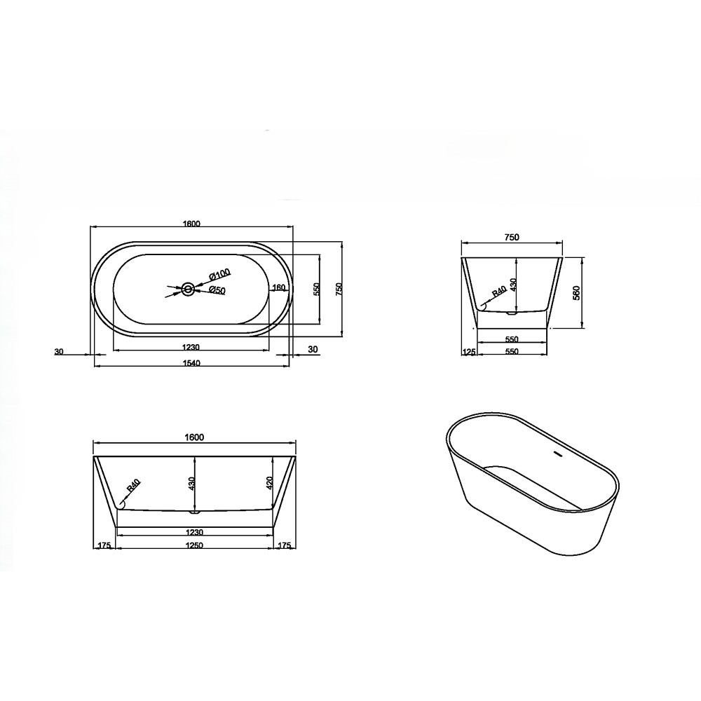 Noa szabadon álló fürdőkád 160x75x56 cm