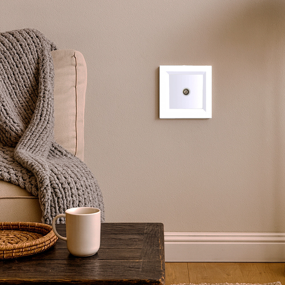 Ez a termékváltozat gyárilag tartalmazza a fehér színű egyes keretet, így nem szükséges külön keretet vásárolni. A lekerekített peremű, kompakt 83 × 83 mm-es kivitel vizuálisan harmonikusan illeszkedik a modern enteriőrökbe, legyen szó otthoni vagy irodai környezetről.