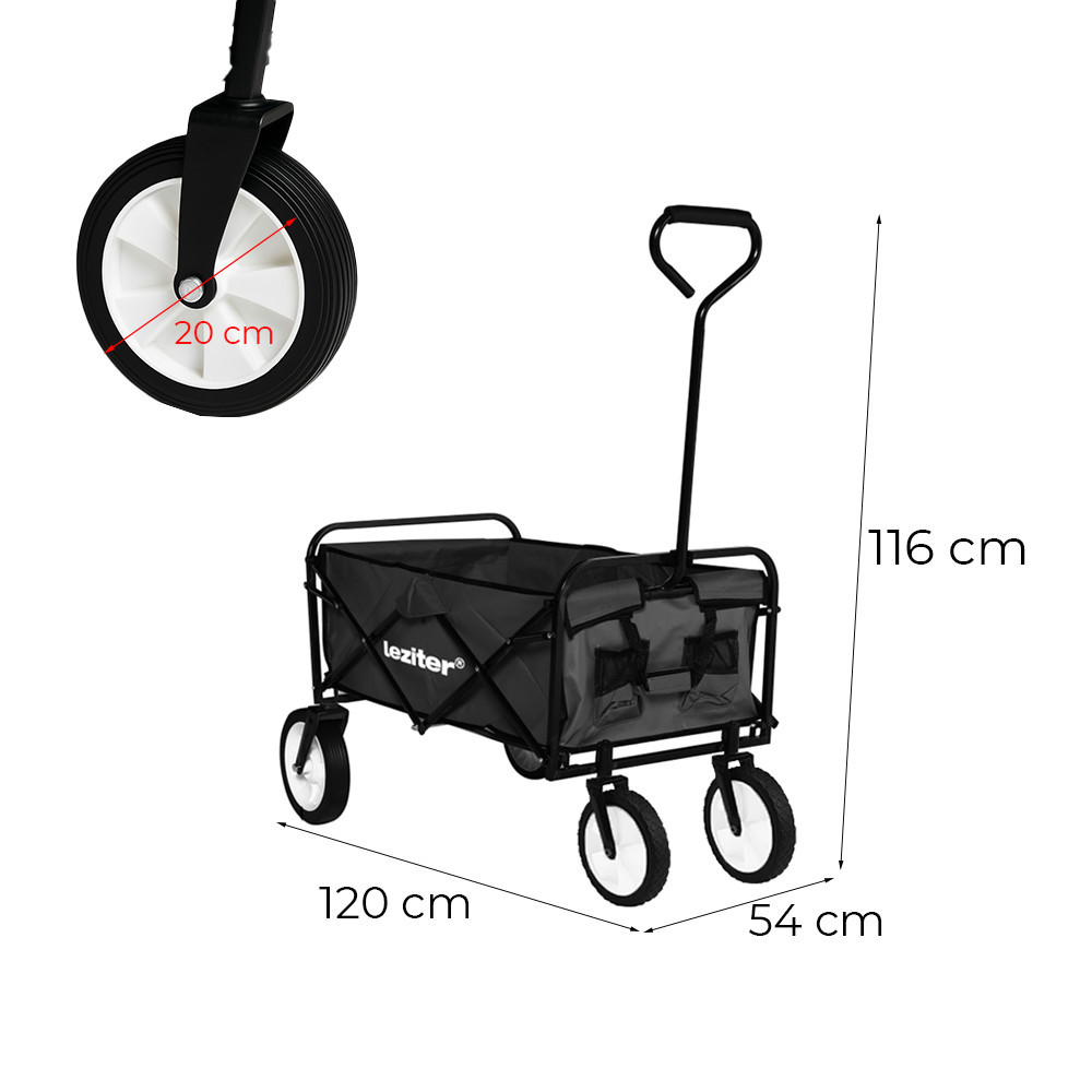 Méretek: A strandkocsi méretei 120X54X54/116 cm. Ezen méreteknek köszönhetően elegendő helyet biztosít a szállítandó tárgyaknak és felszereléseknek, miközben könnyedén összecsukható. Ez lehetővé teszi a könnyű tárolást, vagy akár az autóban történő szállítást anélkül, hogy sok helyet foglalna el.