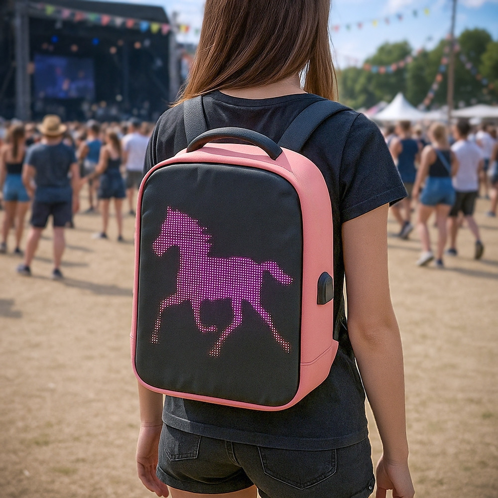 A Pixo LED-es okos hátizsák nem csupán praktikus kiegészítő, hanem a stílusod kiterjesztése is. Az előlapon található 25 × 25 cm-es LED kijelző 64 × 64 pixeles felbontással és 3,9 mm-es képponttávolsággal dolgozik, így színes, éles grafikákat, animációkat vagy szövegeket jeleníthetsz meg rajta teljesen egyedi tartalommal, bármikor.