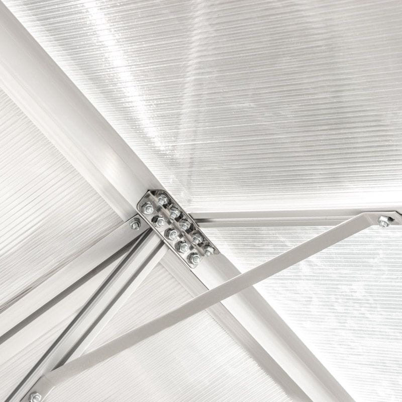 A kerti üvegház falai 4 mm vastag, átlátszó polikarbonátból készülnek, biztosítva a megfelelő fényáteresztést, ami elősegíti a termés megfelelő növekedését. Az üvegház formáját gondosan úgy alakították ki, hogy a fény egyenletesen oszoljon el benne. A szerkezet további előnye a tető kedvező formája, amely lehetővé teszi a vízpára szabad eltávozását, ami megvédi a növényeket a betegségektől.