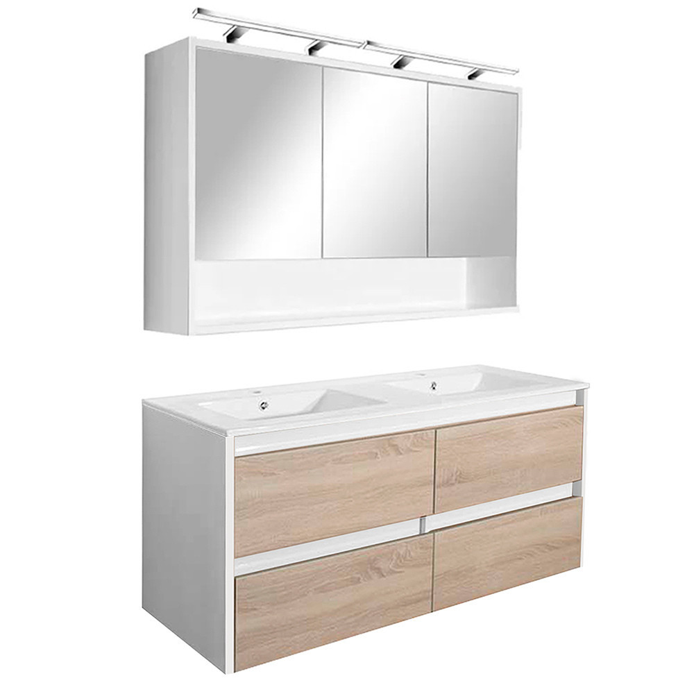 A csomag része a bútorra tökéletesen illeszkedő, fehér színű, dupla medencés kerámia mosdó is, amely két csaptelep számára kialakított hellyel rendelkezik. így nem kell külön keresni hozzá megfelelő mosdót. A csomag nem tartalmazza a lámpát, a csaptelepeket és a leeresztőt!