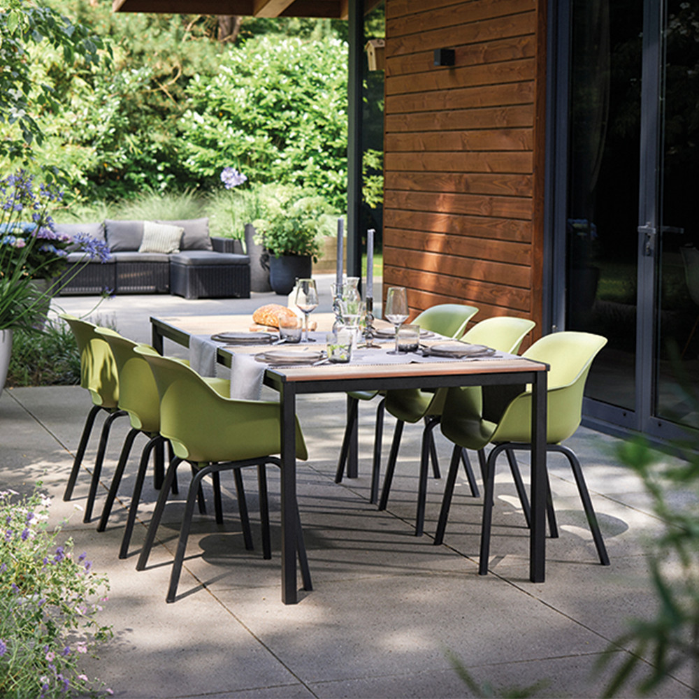 A Porto 160 kerti asztal nem véletlenül tartozik a legnépszerűbb modellek közé. A DecoCoat™ technológiával készült műanyag felület természetes fa hatást kelt, miközben karcálló és UV-álló. A fémváz pedig stabilan tartja az asztalt, nem hajlik, nem rozsdásodik. A tudatos anyagválasztás és a tartós kialakítás együtt biztosítják azt a megbízhatóságot, amit ma már elvársz egy kültéri bútortól.