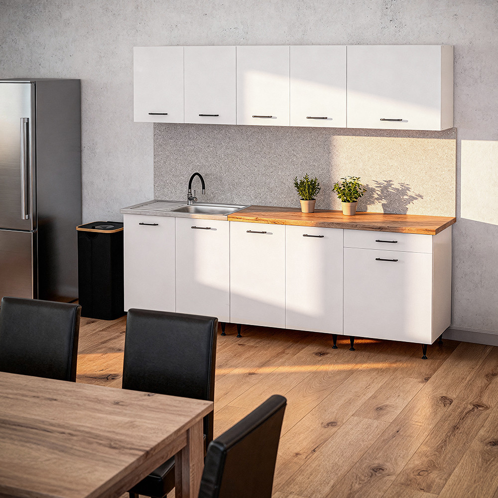 A Leziter Primo 220 konyhabútor fehér korpusszal és Charlestone tölgy munkalappal könnyen illeszkedik a modern otthonok világos, letisztult enteriőrjébe. Harmonikus színvilága friss, tágas hatást kelt, így ideális választás kisebb és közepes méretű konyhákhoz. Átgondolt elemkiosztása praktikus, jól szervezett mindennapi használatot kínál, miközben egységes, rendezett összképet biztosít.