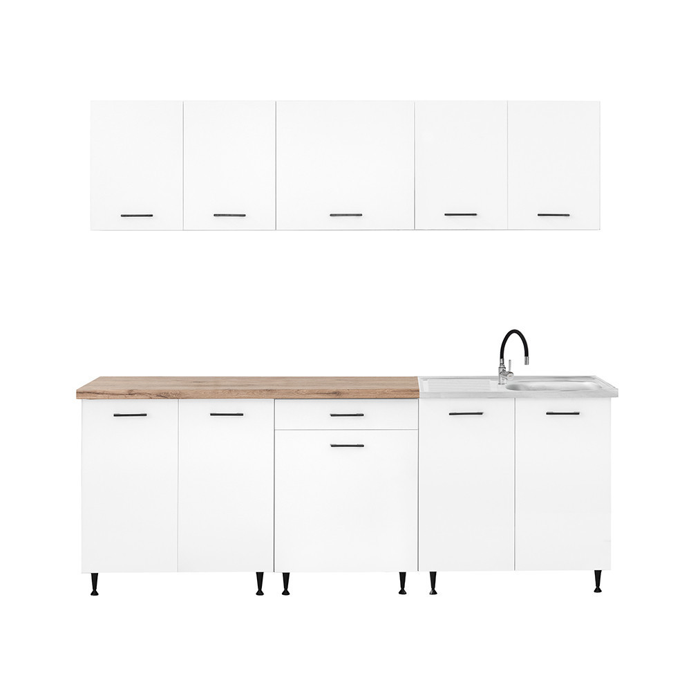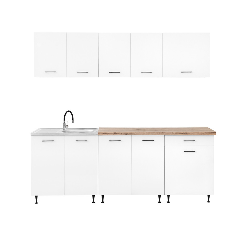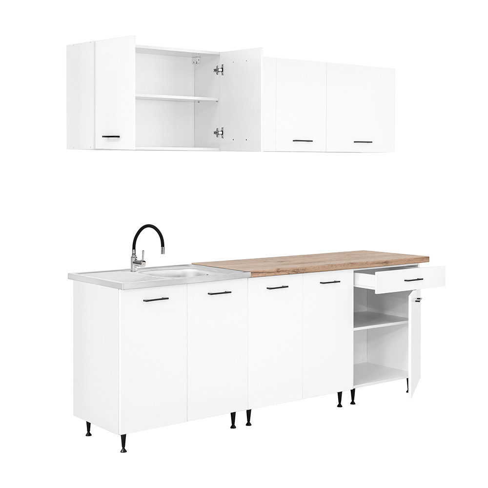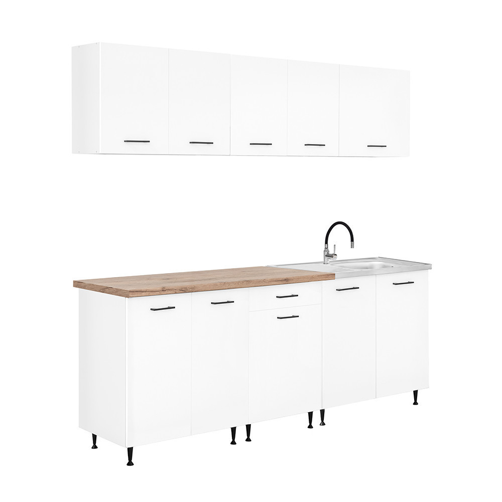 A 220 cm széles konyhabútor három felső és három alsó elemből áll, amelyek praktikus tárolóhelyet kínálnak a konyhai eszközök számára. A két 80 cm széles alsó szekrény alkalmas nagyobb edények vagy konyhai kellékek elhelyezésére, míg a 60 cm-es fiókos–ajtós elem jól használható evőeszközök és kisebb tartozékok rendszerezésére.