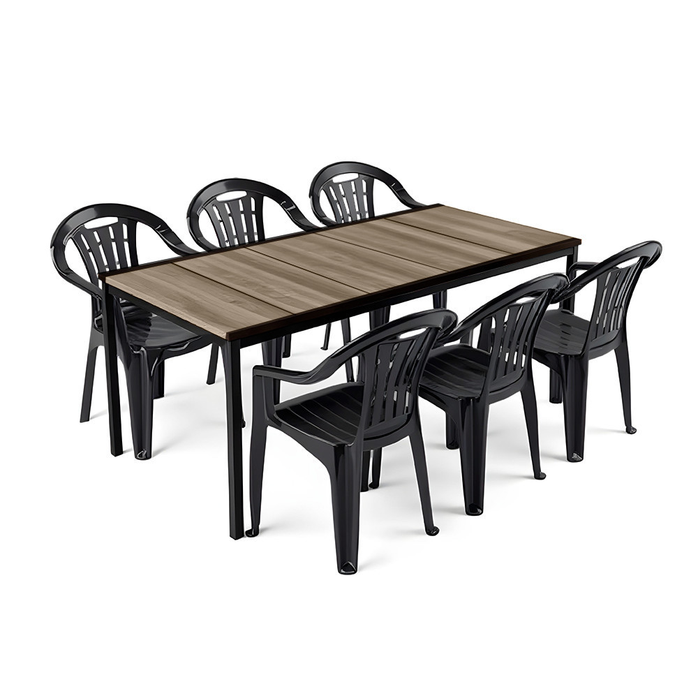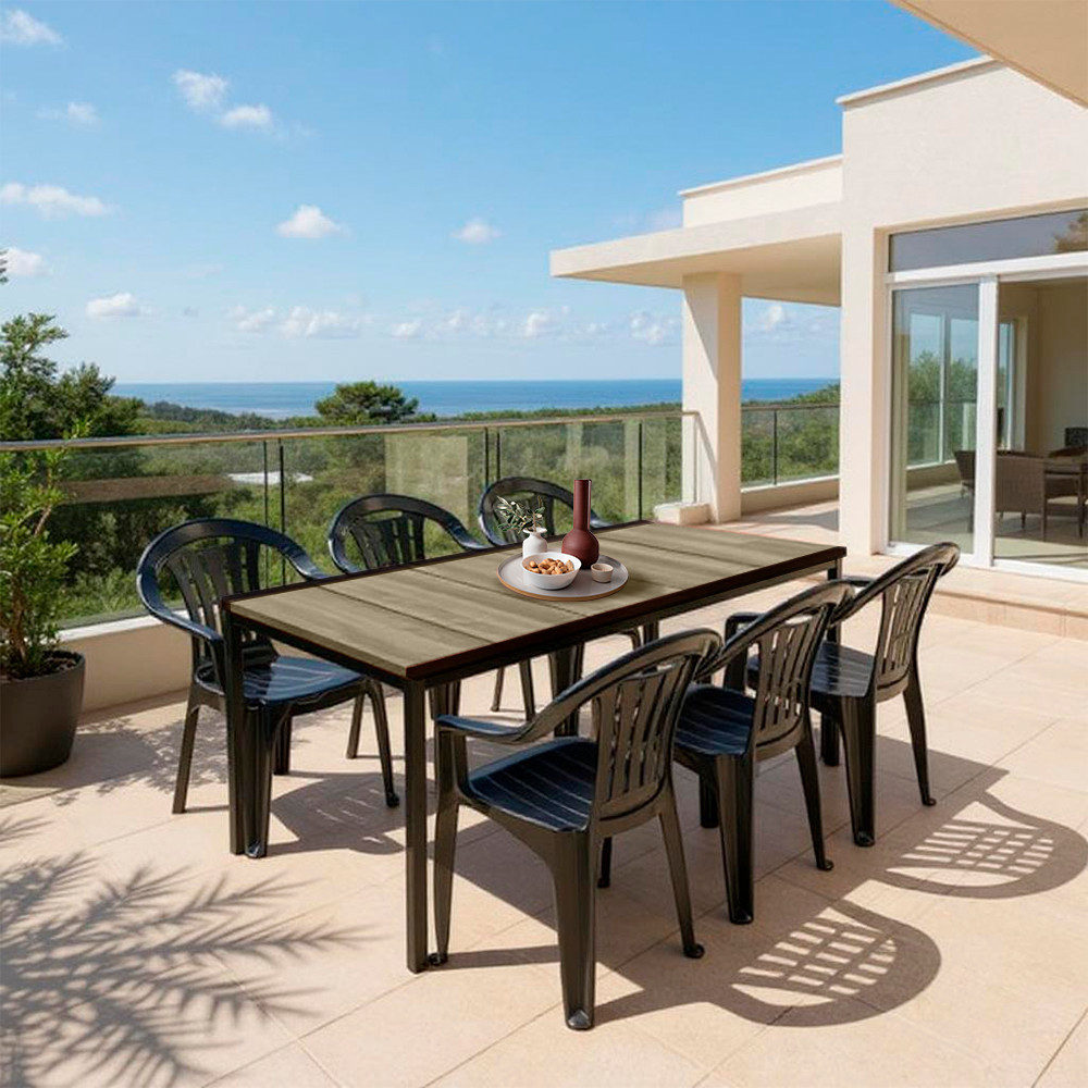 A Mallorca székek és a Porto 200 asztal ellenáll az átlagos időjárási viszonyoknak, UV-álló fröccsöntött polipropilénből készültek, amely nem repedezik, nem rozsdásodik és nem fakul. A Porto asztallap különleges DecoCoat™ fa hatású felülete valódi erezetet idéz, mégis karc-, víz- és időjárásálló. A fekete acélváz stabil tartást biztosít, rozsdásodás nélkül.