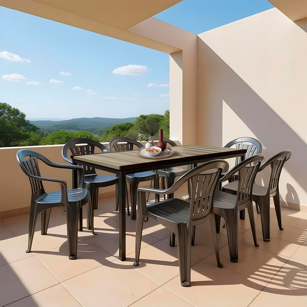 A Mallorca székek ergonomikus formája – ívelt háttámlával és kartámasszal – kényelmes ülést biztosít hosszabb étkezések során is. Ha épp nincs szükséged az összes székre, egymásra pakolva helytakarékosan tárolhatók, így még a kisebb udvarokban is praktikus megoldást nyújtanak.