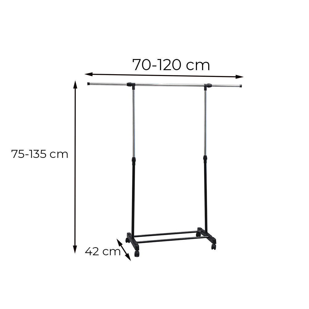 • Állítható magasság: Az állvány magassága 75 cm és 135 cm között állítható, így különböző méretű ruhák tárolására is alkalmas, legyen szó hosszú kabátokról vagy rövid blúzokról.