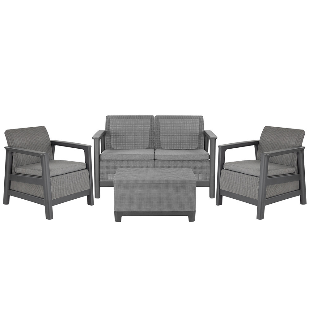 A szett kényelmes beszélgetősarkot alakít ki a kertben vagy a teraszon. Egységes, modern kültéri nappali hozható létre vele, miközben a tárolós asztal praktikus helyet biztosít a kiegészítőknek. Időjárásálló, gondozásmentes megoldás, amely rendezetten és átgondoltan formálja a kültéri teret.