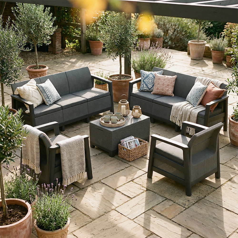 A szett kényelmes beszélgetősarkot alakít ki a kertben vagy a teraszon. Egységes, modern kültéri nappali hozható létre vele, miközben a tárolós asztal praktikus helyet biztosít a kiegészítőknek. Időjárásálló, gondozásmentes megoldás, amely rendezetten és átgondoltan formálja a kültéri teret.