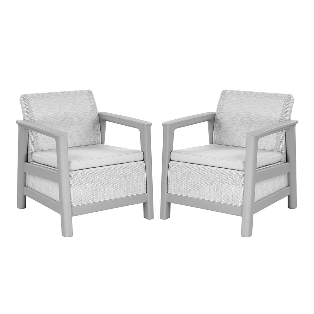 A Scandi Linea Duo kerti fotel szett letisztult, egységes formavilágot képvisel. A hamuszürke-világosszürke árnyalat texturált felület természetes megjelenést biztosít, amely jól illeszkedik zöld környezethez és modern kültéri burkolatokhoz. A két fotelből álló összeállítás harmonikus ülőhelyet teremt teraszon, kertben vagy tágas erkélyen, miközben a visszafogott színvilág könnyen kombinálható más Scandi elemekkel.