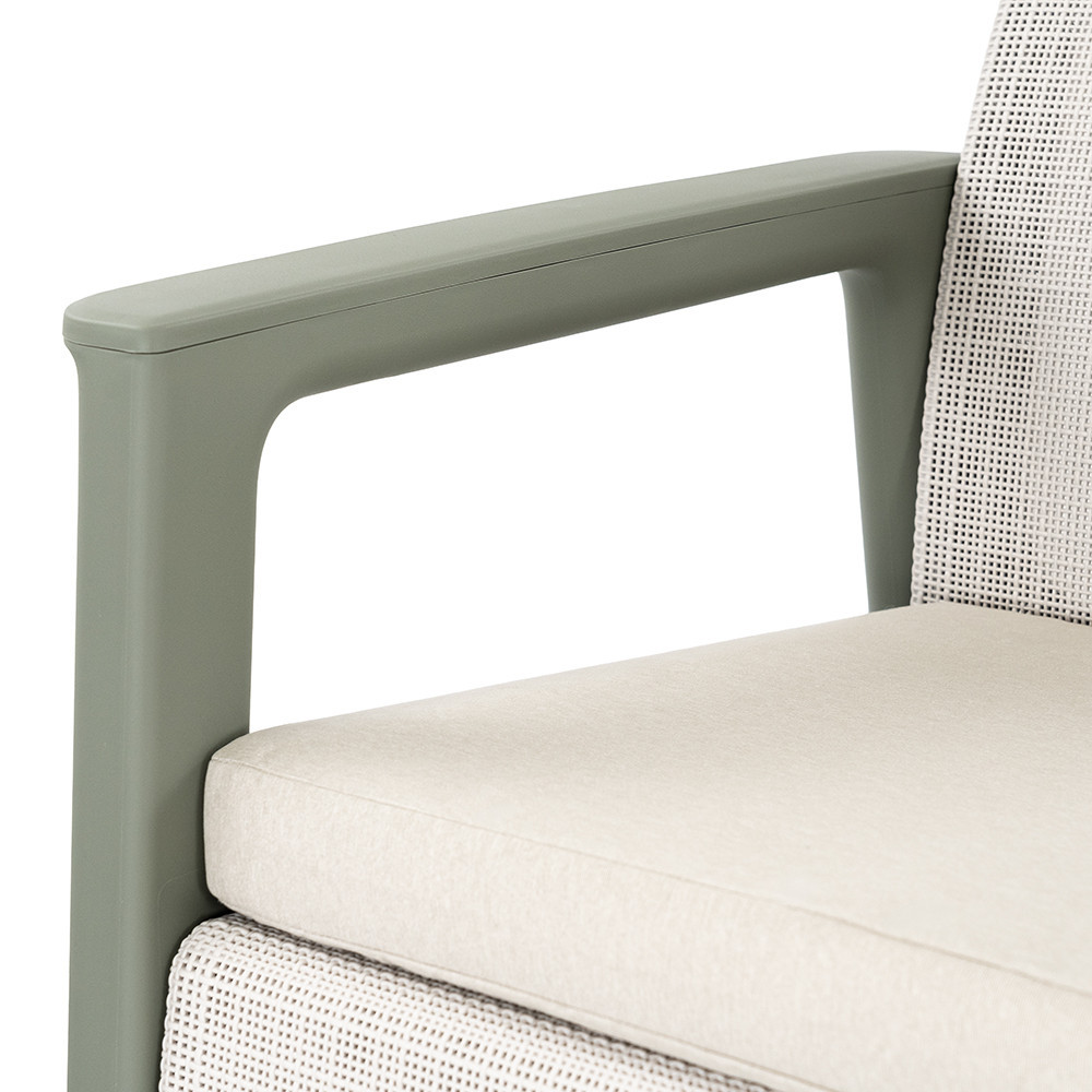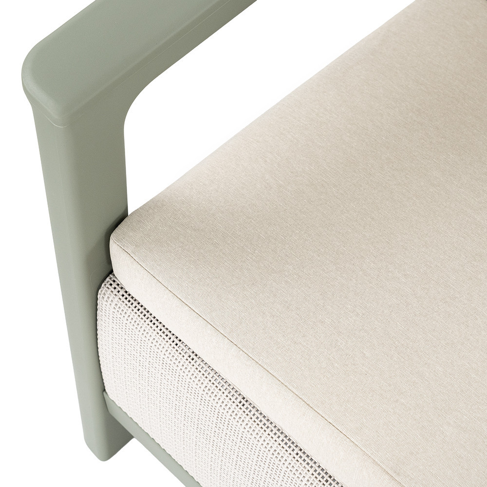 A Scandi Linea kerti bútor szett letisztult, egységes megjelenést ad kertben vagy teraszon. A zsálya zöld-homok szín természetes hatású, jól illeszkedik zöld környezethez és modern burkolatokhoz. A két fotel, a 2 személyes kanapé és a tárolós asztal együtt kényelmes, kompakt kültéri ülőgarnitúrát alkot pihenéshez és beszélgetésekhez.