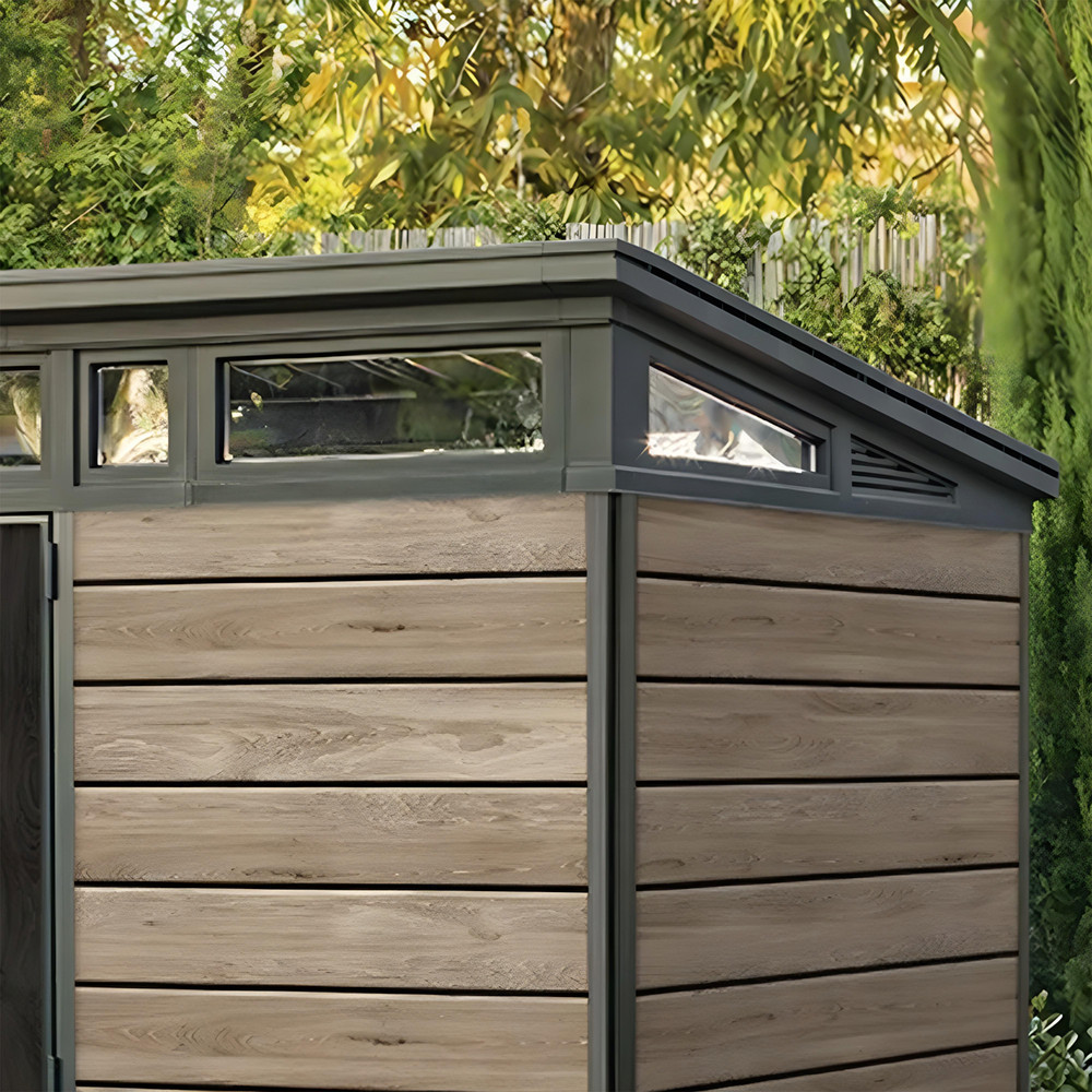 A Signature PENT 11x7 kerti ház ötvözi az esztétikát és a funkcionalitást. A ferde tető és letisztult vonalvezetés tökéletesen illeszkedik a modern kertépítési trendekhez, míg a kőrisfa színű DECOCOAT technológia időjárásálló felületet biztosít.