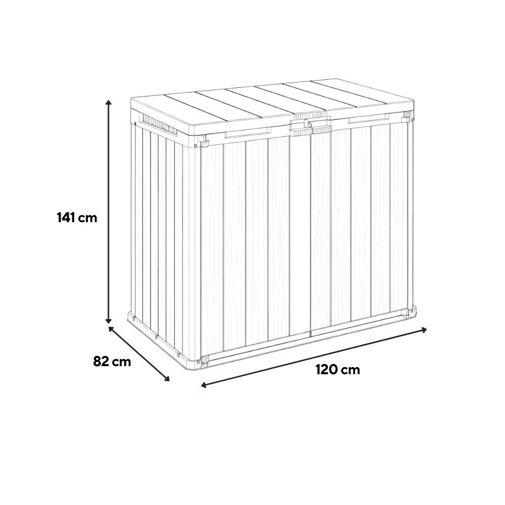 A DecoCoat technológiával készült felület ötvözi a tartósságot a természetes fa struktúráját idéző elegáns megjelenéssel. Az anyag ellenáll az esőnek, nedvességnek és az UV-sugárzásnak, így a tároló hosszú időn keresztül megőrzi esztétikus megjelenését karbantartás nélkül.