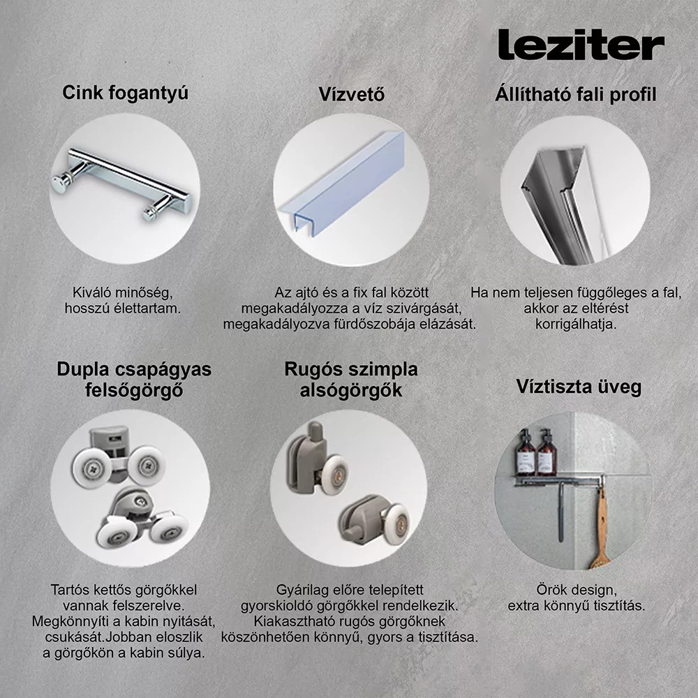A Leziter egyik kiváló termékcsaládja, a Spirit egy rendkívül sikeres szériát képvisel különféle zuhanykabinjaival. Változatos modelljeinek közös jellemzője az 4 mm vastagságú biztonsági üveg, a kifinomult dizájn és a megbízhatóság. A tolóajtós kabinok felül szimpla, alul dupla rugós görgőkkel vannak ellátva, amelyek megkönnyítik a zuhanykabin takarítását - a kiakasztható görgők miatt megvalósul a háziasszonyok álma: csupán pár perc és gyönyörűen tisztává varázsolható a kabin! A fényes króm kere