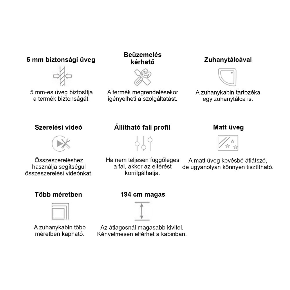 • Magasság: 180 cm (kabin), 194 cm zuhanytálcával együtt