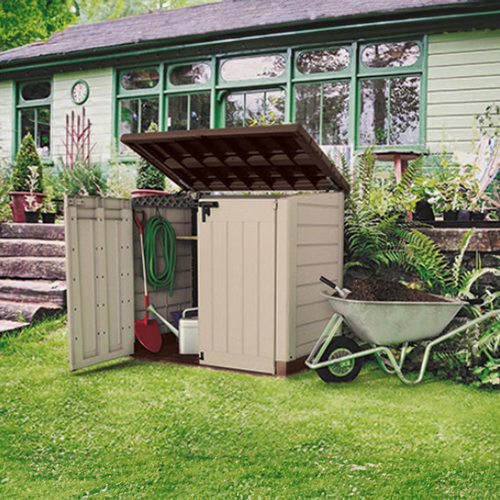 A Store in out max nagy méretű tárolótere ideális választás a kerti felszerelések, például a fűnyírók, kerti bútorok vagy sporteszközök tárolására. A belső tér tágas kialakítása biztosítja, hogy minden kerti eszköznek meg legyen a helye.
