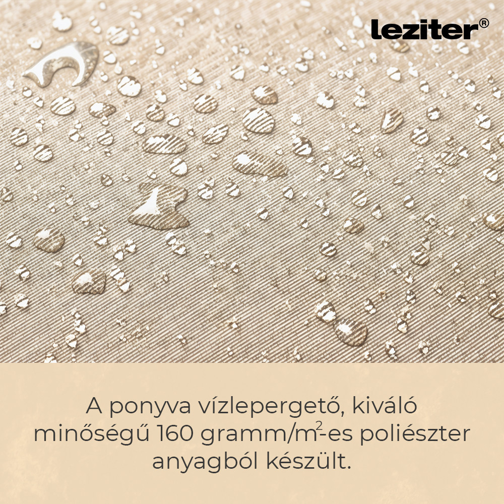 A Leziter Sunny kerti napernyő 300 cm átmérőjű kialakítással rendelkezik, amely egyenletes lefedést biztosít az árnyékolt területen. A kör alakú forma jól használható kertekben, teraszokon vagy kerti bútorok fölött. A ponyva kialakítása a mindennapi kültéri használathoz igazodik, felülete vízlepergető, így a nedvesség nem szívódik fel azonnal. A bézs szín világos, visszafogott megjelenést ad, amely könnyen illeszkedik különböző kültéri környezetekhez.