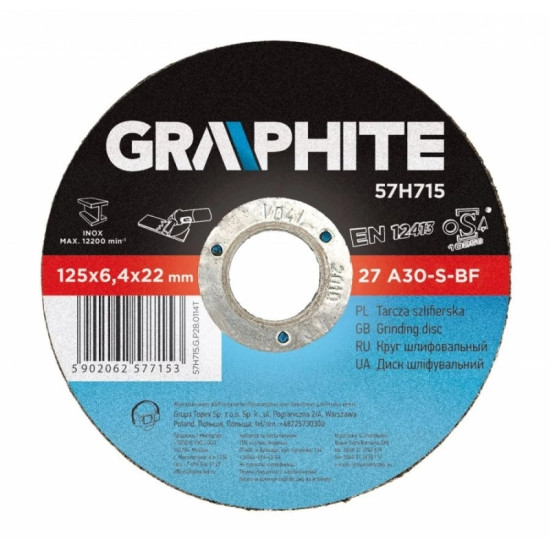 A GRAPHITE fémcsiszoló tárcsa az üzemközi sérüléseknek igen ellenálló a háromszoros erősítő hálórétegnek köszönhetően. A termék megfelelése az EN 12413 szabványnak biztosítja a munkavégzés magas fokú biztonságát.