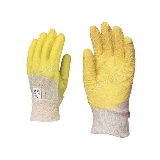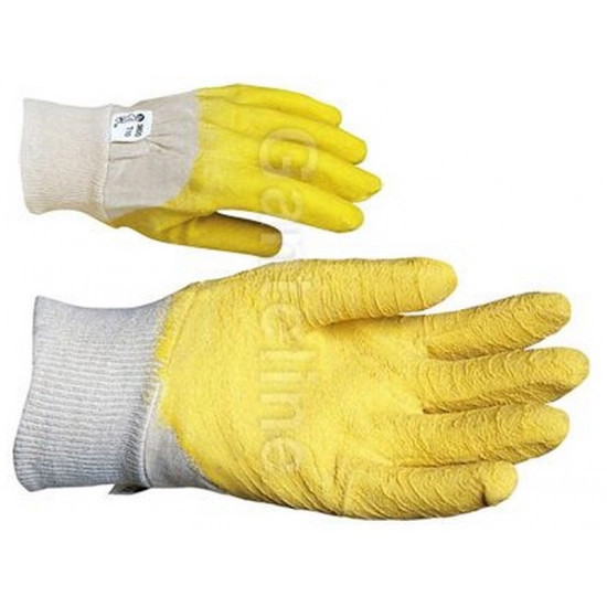 MÁRTOTT SÁRGA LATEX, CSÚSZÁSBIZTOS, SZELLŐZŐ KÉZHÁT_10 SÁRGA KREPP LATEX KESZTYŰ: • szövött pamut alapkesztyűre ökölcsontig mártott sárga latex • gumírozott mandzsetta, szellőző kézhát • csúszásmentes érdesítés • MÉRET: 10-es • CSOMAGOLÁS: 120/12 • EU szabvány: EN420, EN388: 2121
