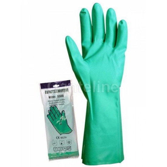 NITRIL, ZÖLD VEGYSZERÁLLÓ KESZTYŰ, 32CM/0,4MM, ÉRDESÍTETT_10 ZÖLD BÉLELT AKRILONITRIL KESZTYŰ 32 CM: • zöld akrilonitril • pamutbolyhozott belső • sav-, lúg-, olaj-, zsír-, és vegyszerálló • mikroorganizmusok elleni védelem • csúszás ellen érdesített tenyér • 0,38 mm vastag, 32 cm hosszú • méret: 10-es • CSOMAGOLÁS: 100/10 • EU szabvány: EN420, EN388: 4002, EN374-1, 374-2, 374-3: AJK
