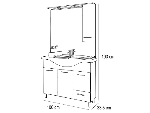 A fürdőszoba bútor kevés helyet foglal viszont tágas alsó bútorral és felső szekrénnyel rendelkezik ahol kényelmesen elférnek a fürdőszobai pipere eszközök. Kevés helyigénye miatt kisebb fürdőszobák berendezésére is alkalmas, például panel lakásokban. A termék magas minőségű bútorlapból készül és színben passzoló élzárókkal van ellátva. A fürdőszoba bútor álló kivitelben kapható.