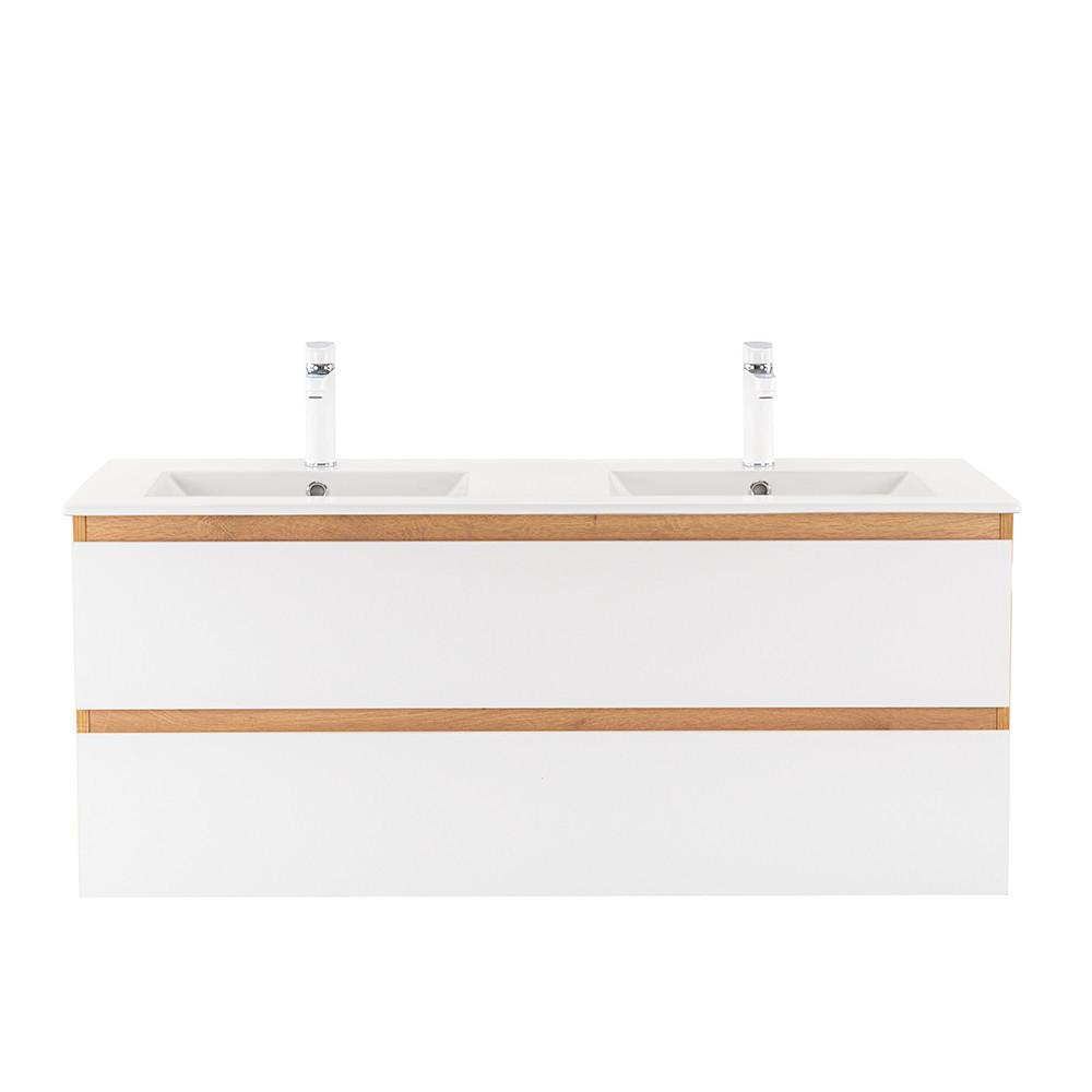 • Elegáns és praktikus mosdó: A bútor flat design kerámia mosdóval érkezik, amely kétmedencés kivitelű. Modern, esztétikus és könnyen tisztítható.