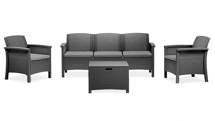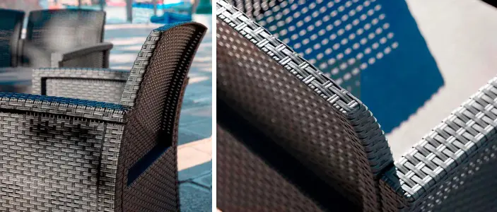 Megejelenés: A bútport esztétikussá teszi az eredeti rattanra emlékeztető felület, valamint a fotelek és a kanapé kényelmes ülőrészei. A bútor szett ideálisan beleillik minden ház körüli térbe és kényelmes lehetőséget teremt a szabad levegőn való pihenéshez.