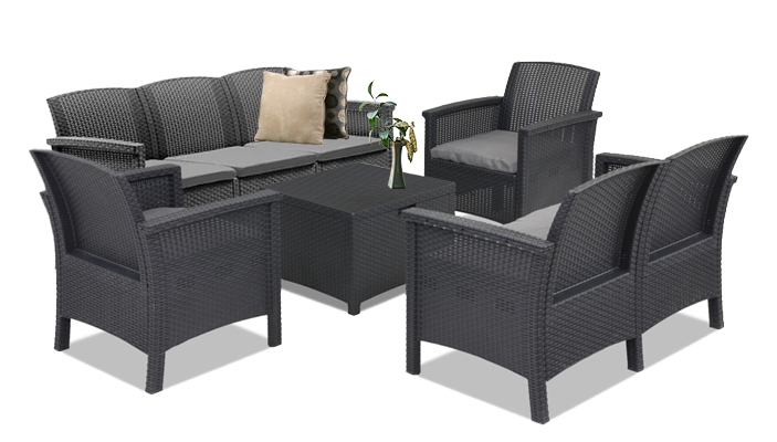 Ez az olasz gyártmányú, grafit színű, kényelmes és elegáns bútor szett két 63 x 64,5 x 76 cm-es fotelt, egy 117 x 64,5 x 76 cm-es két személyes kanapét, egy 172 x 64,5 x 76 cm-es három személyes kanapét és egy 60 x 54,5 x 40,5 cm-es négyszögletes asztalt foglal magába. Ez a 7 személyes kerti bútor szett rendkívül előnyös lehet, ha szeretnéd kiélvezni a szabadban eltöltött időt barátaiddal vagy családoddal.