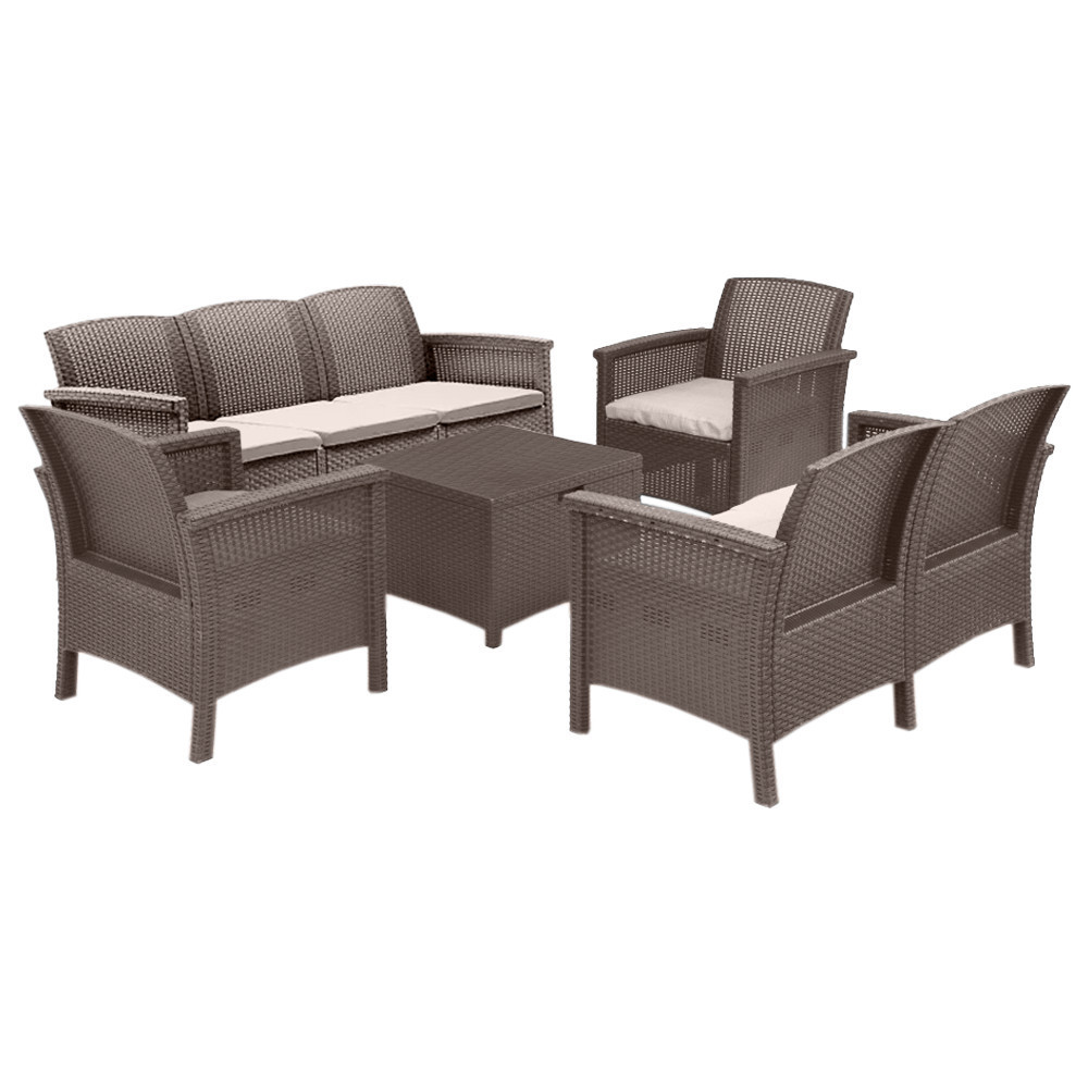 Ez az olasz gyártmányú, barna színű, kényelmes és elegáns bútor szett két 63 x 64,5 x 76 cm-es fotelt, egy 117 x 64,5 x 76 cm-es két személyes kanapét, egy 172 x 64,5 x 76 cm-es három személyes kanapét és egy 60 x 54,5 x 40,5 cm-es négyszögletes asztalt foglal magába. Ez a 7 személyes kerti bútor szett rendkívül előnyös lehet, ha szeretnéd kiélvezni a szabadban eltöltött időt barátaiddal vagy családoddal.