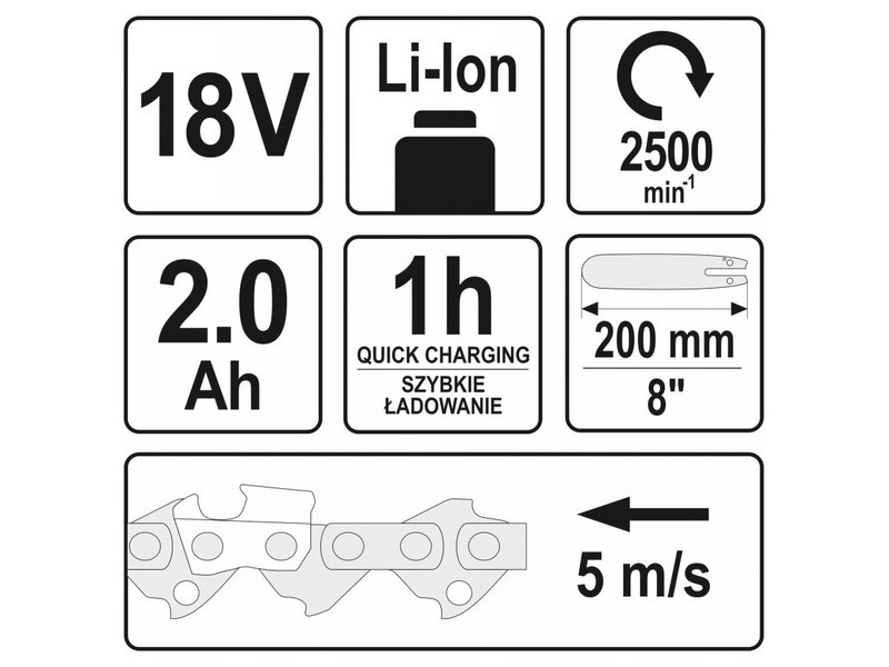 A készlet tartalma: limbing gép, Li-Ion 18 V 2 Ah akkumulátor, gyorstöltő (1 óra a 2 Ah akkumulátorhoz).
