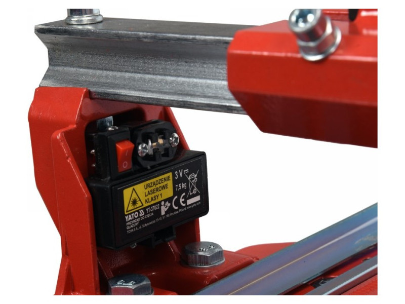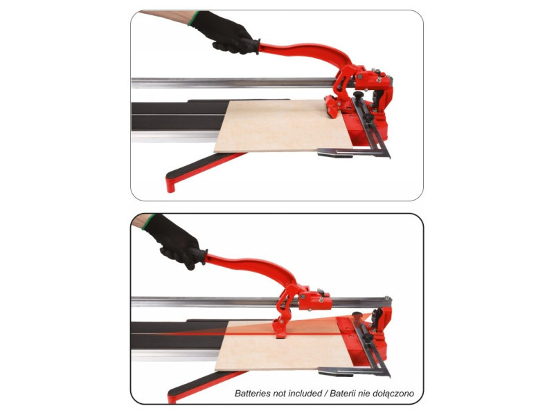 Vágógép maximum 12 mm vastagságú és 800 mm hosszúságú kerámialapok vágásához és töréséhez. A lézermutató bekapcsolásakor a vágandó csempe felületén egy piros sugár jelenik meg, amely a pontos vágási vonalat jelzi.