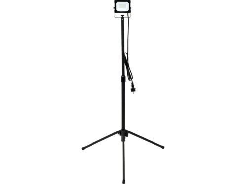 Stabil, állítható állványon elhelyezett, nagy teljesítményű SMD LED-ekkel ellátott lapos reflektor. Az IP65 védelmi osztály lehetővé teszi a kültéri használatot.