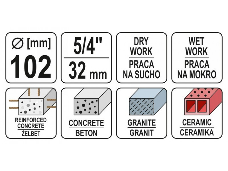 YATO koronafúró fúrófej fúróállványhoz, amelyet ütésmentes - száraz és nedves - fúróállvánnyal történő munkához terveztek (pl. YT-81980). Lehetővé teszi a gyors és pontos furatok fúrását, állvány nélkül is, vasbetonban, betonban, szilikátban, pl. elektromos dobozokhoz, mennyezetek fúrásához csövek és kábelek számára, kábelvezetékek vagy szellőzőcsatornák telepítéséhez.