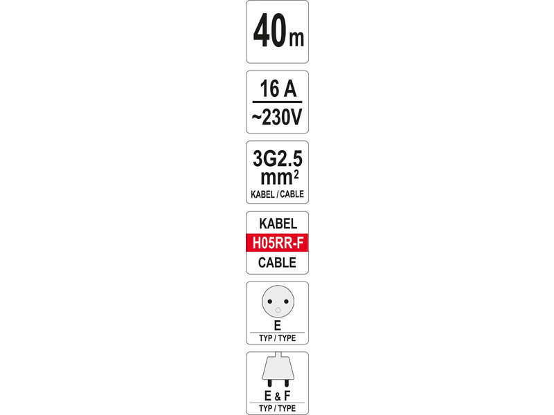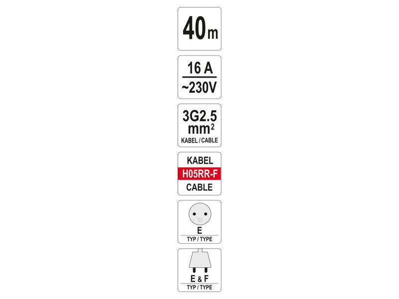 YT-8107 40 méter hosszú építőipari és műhelytekercses hosszabbító kábel 4 por- és fröccsenésbiztos aljzattal, hővédelemmel és gyermekvédelemmel. A tartós műanyagból készült dobra tekert, természetes gumiborítású kábel a hosszabbító kábelt beltéri és kültéri használatra teszi alkalmassá, pl. építkezéseken, kertben, gyárak előtt.